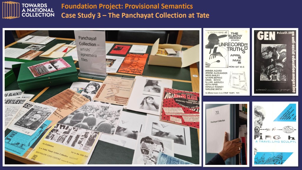 It focused on the Panchayat Collection, which contains publications, documents and ephemera relating to the practice and exhibition histories of artists with South Asian, Caribbean, and African heritage, living and working in Britain during the 1980s and 1990s. The collection was established and built by a group of 5 such artists, in the 1980s, calling themselves the Panchayat Arts Education Resource Unit. The collection entered the Tate Library in 2015, but had not been catalogued by the time the project started in 2020. Additionally, its ephemera and archive items were inadequately served by library cataloguing systems and current library search terms, a combination which rendered them effectively invisible.