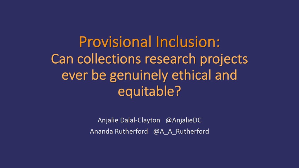 As usual these are speaking notes rather than anything more worked up and they were given in slightly tricky circumstances as family and health reasons (yes covid again) meant neither Anjalie nor I could be at the event itself. The event was Towards a National Collection Conference 2023: Unlocking the Potential of Digital Collections, at the British Museum, 26 April 2023 (recordings of all the talks can be found here) and we were supposed to be speaking on an panel on “Inclusion” chaired by Laura van Broekhoven and alongside Setareh Noorani, which would have been lovely as they are both very brilliant women doing good work. Our collegue and the Transforming Collections project Principle Investigator susan pui san lok was luckily able to step in at the last minute for the panel discussion.